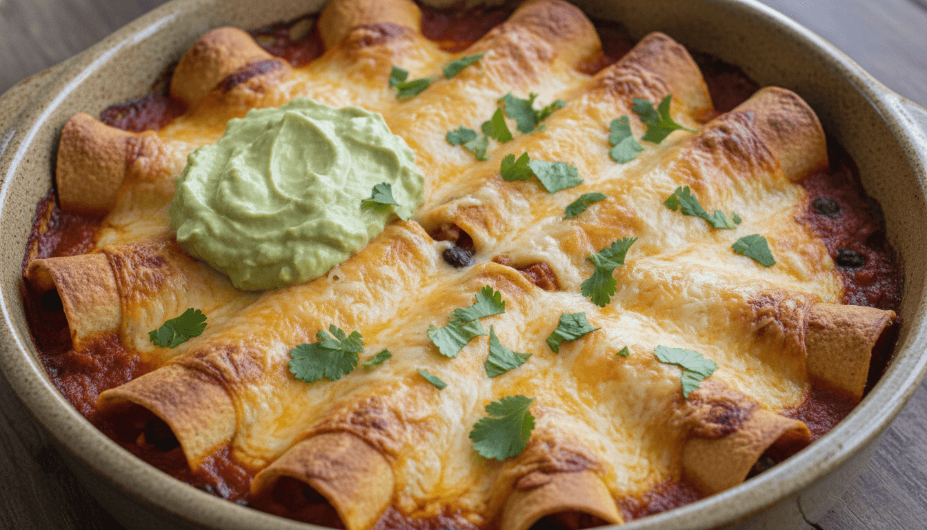 Cozy & Vibrant: Sweet Potato & Black Bean Enchilada Bake with Zesty Avocado Crema