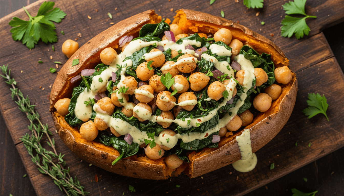 Cozy & Vibrant: Spiced Chickpea & Spinach Stuffed Sweet Potatoes with Lemon-Herb Tahini Drizzle